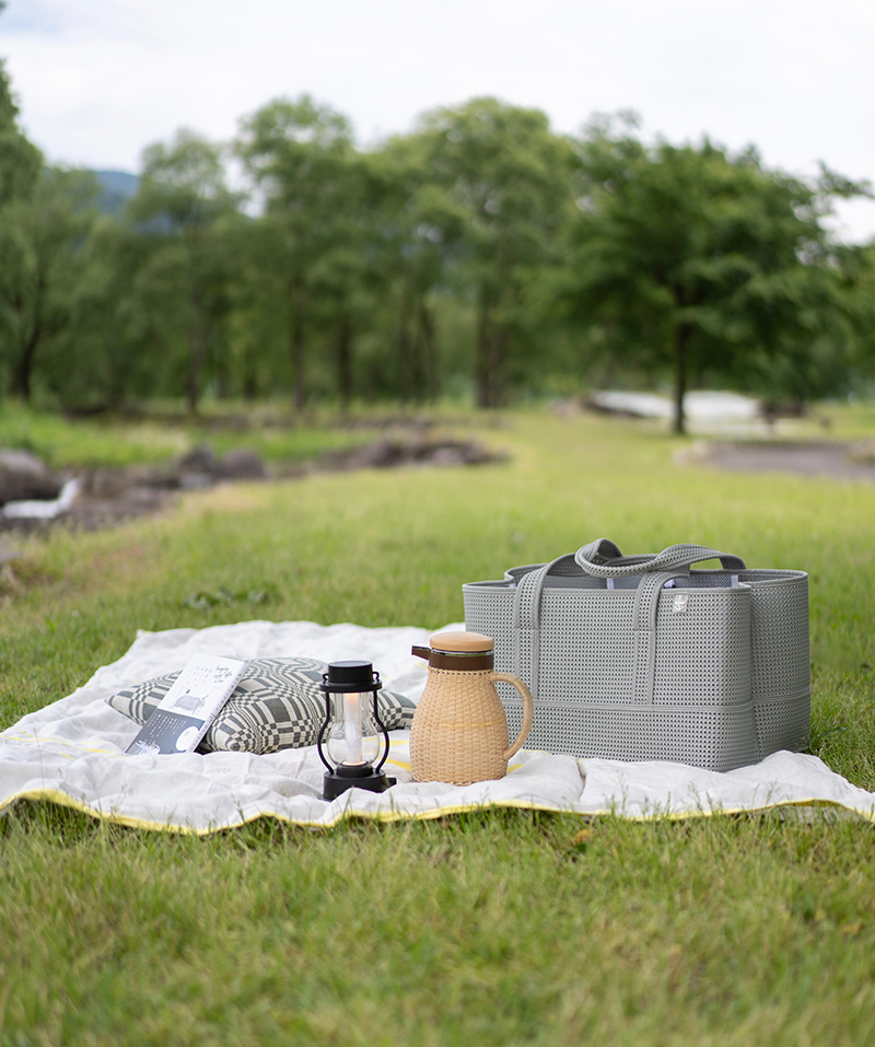 公園遊びやプール、アウトドアグッズを入れるのに最適な「ライトコンテナバッグ」。今年新たに、アンジェ別注カラーのライトグレ...
