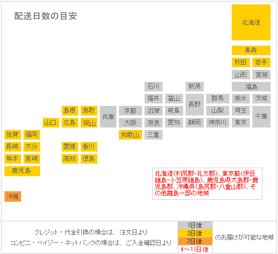 ※天候状況により、各交通機関に乱れが発生した場合や物流の急激な増加による運送会社の混雑等により、ご案内のお届け予定日時よりも、遅れが出る場合がございます。どうぞご了承下さい。