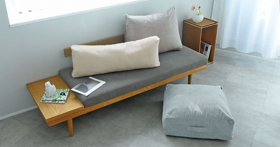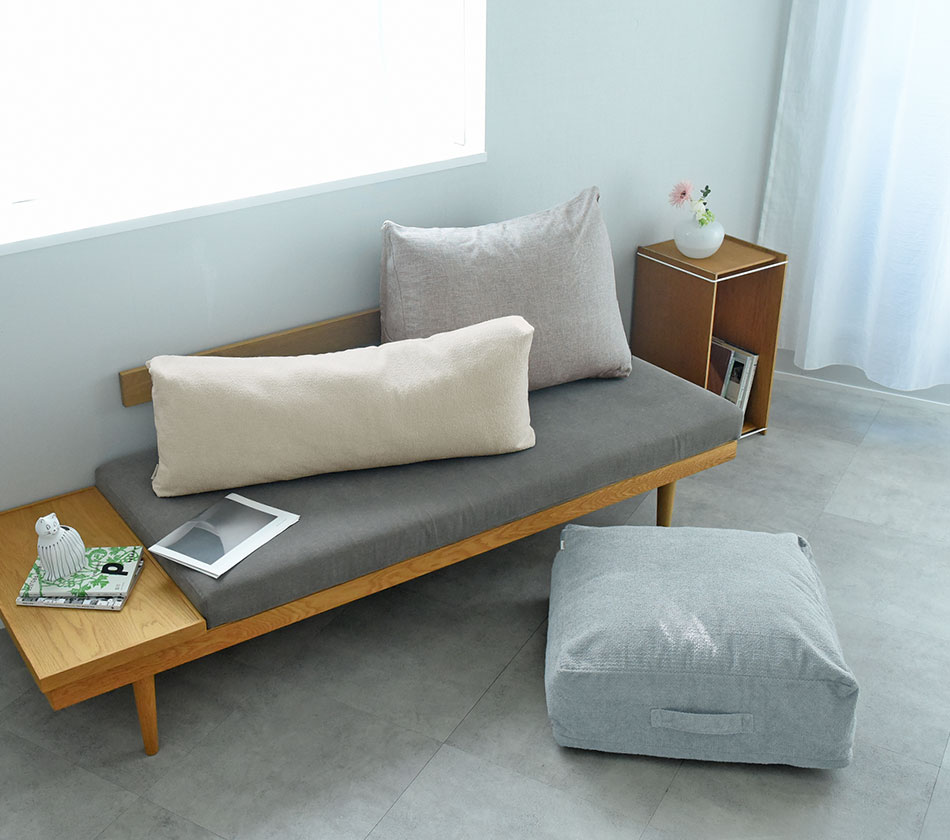 押し入れやクローゼットなど、どうしても収納場所を確保できないときには見せる収納もおすすめ。生活感のないカラー・デザインの布団収納ケースならリビングにもなじみやすく、クッションやソファーの代わりとして活用できます。