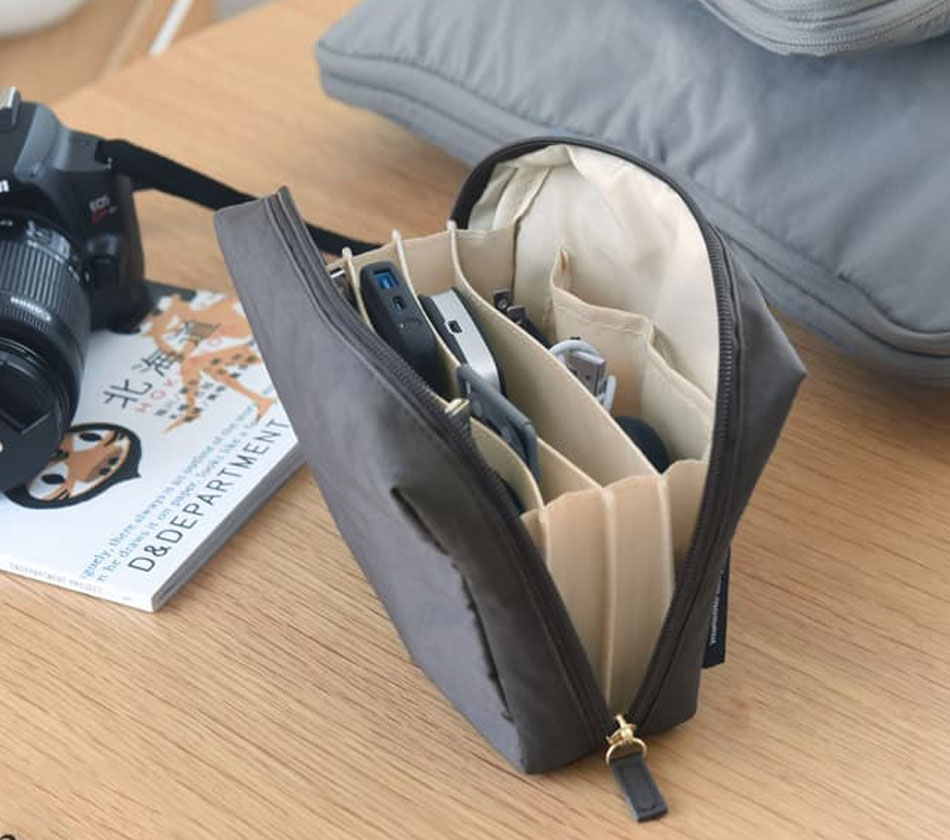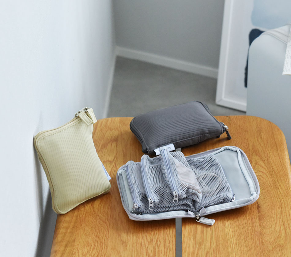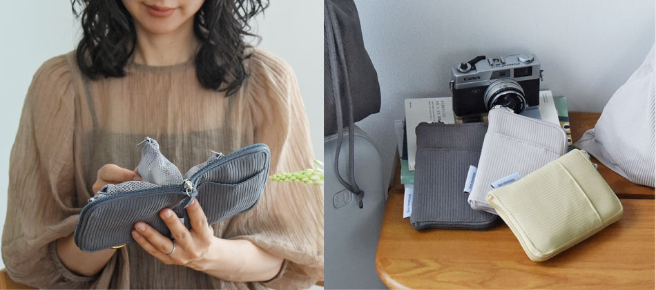 圧縮ポーチがぎゅっと小さくなったような見た目の「手帳ポーチ」が登場しました。色々な場所に散らばる小物をいっその事ひとつにまとめてしまおうと企画されたもの。ページをぱらぱらめくるような感覚で使えて、探し物もすぐ発見できます。