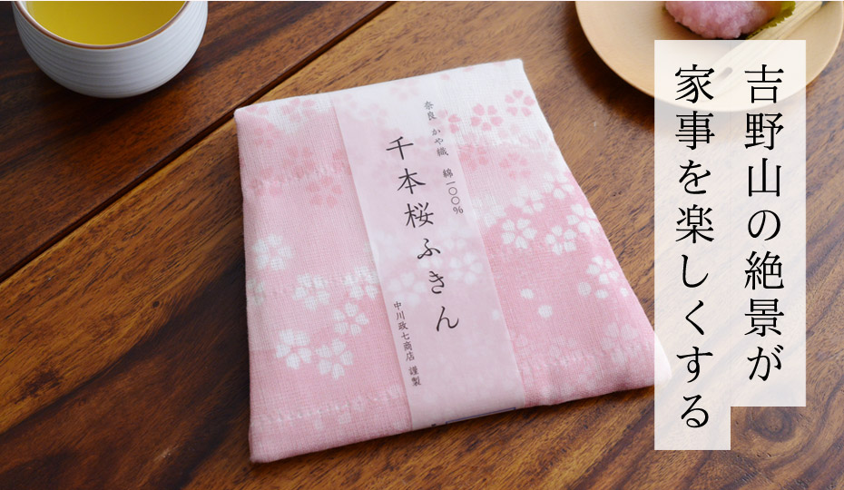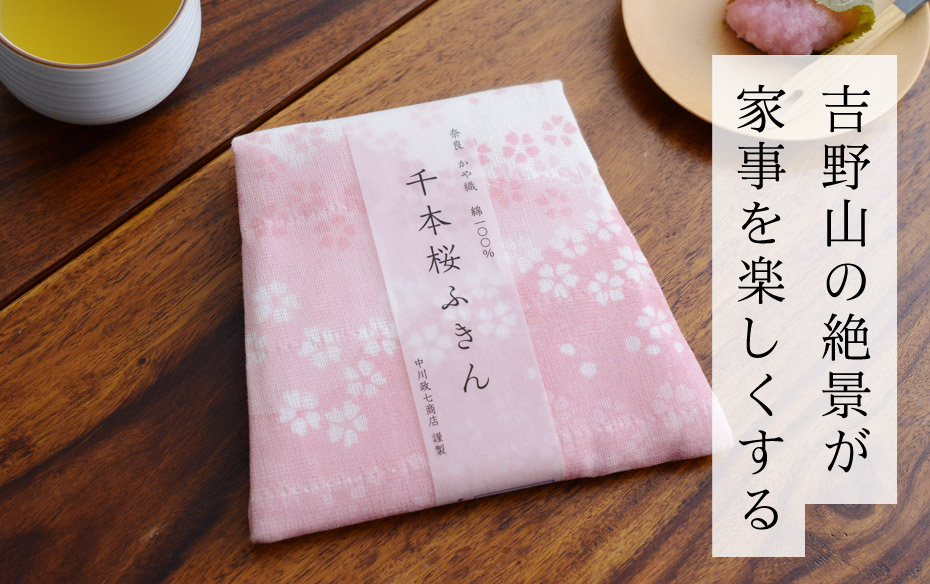 奈良県吉野山の千本桜をイメージした、4層の桜が描かれたふきん。お料理や台拭きの瞬間にも、季節を感じさせてくれます。