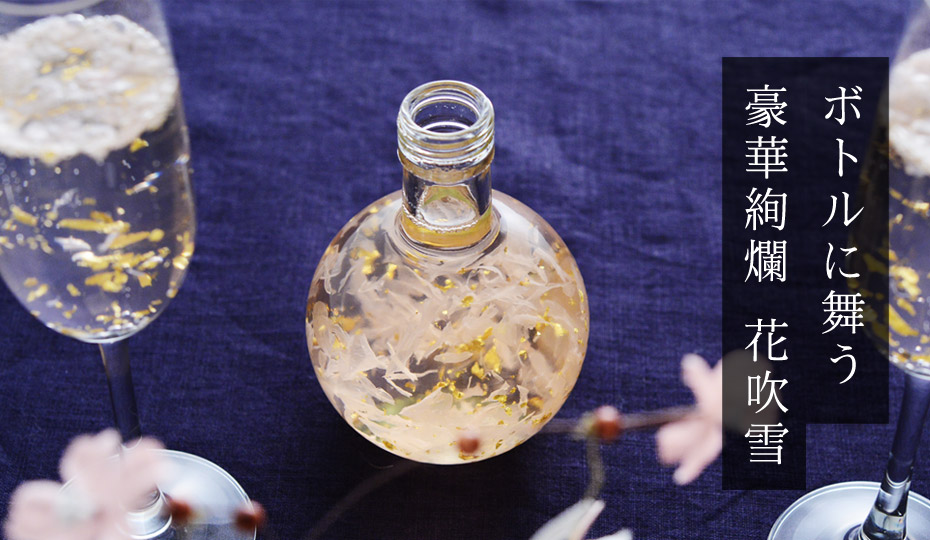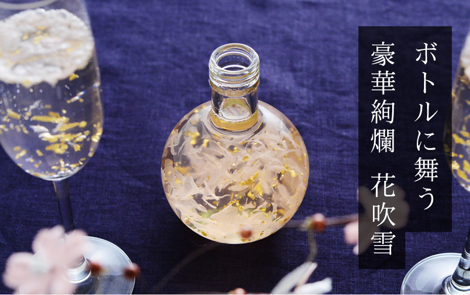 小さなボトルに詰められたのは、桜の花びらと金箔が浮かぶリキュール。スグに飲むのは勿体ない、飾れるお酒です。